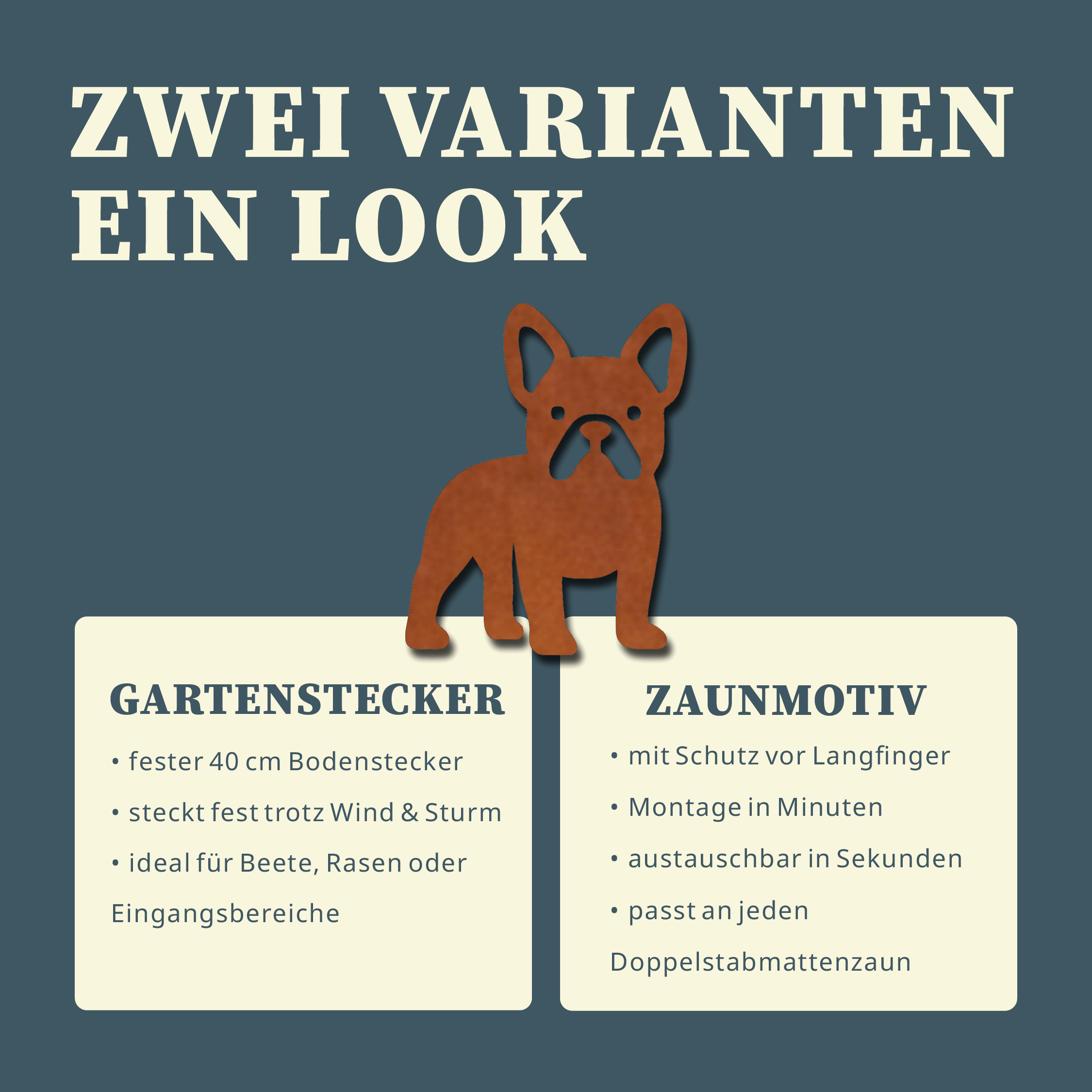 Die Bulldogge ist vielseitig einsetzbar: Am Doppelstabmattenzaun montiert wirkt sie wie ein kleiner Wächter. Im Beet setzt sie zwischen Gräsern oder Blumen dekorative Akzente. Auf der Terrasse oder am Balkon sorgt sie für eine tierische Note, die sofort auffällt. Besonders harmonisch wirkt die Silhouette der Bulldogge in Kombination mit Naturmaterialien wie Holz oder Stein – modern, charmant und voller Charakter.