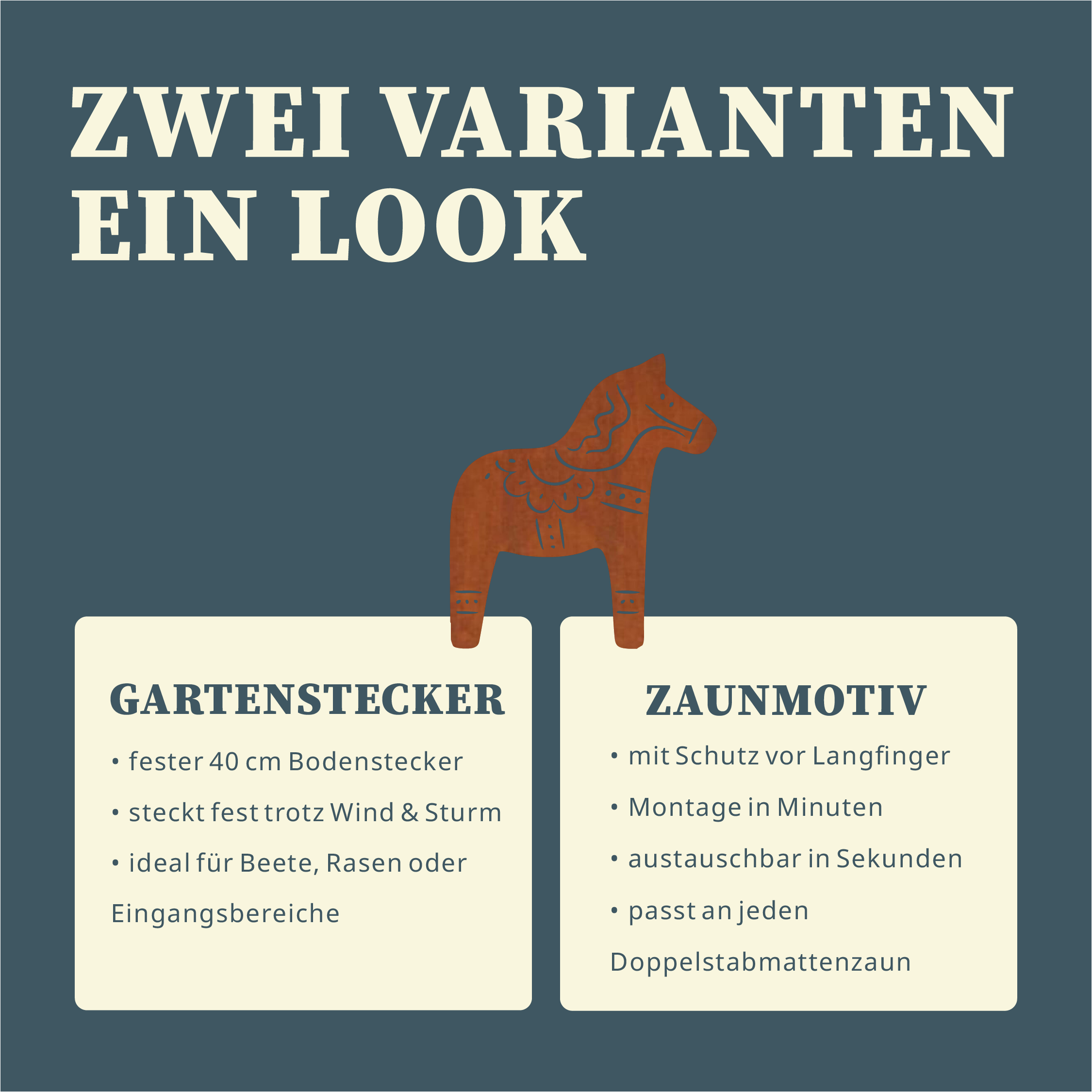 Das Dala Pferd symbolisiert seit Jahrhunderten Glück, Stolz und Schutz. Mit seiner klaren Silhouette und den zarten Gravurlinien fängt es die Essenz nordischer Ästhetik ein: schlicht, ehrlich und kraftvoll. Ob als Zaunmotiv oder Gartenstecker – dieses Pferd zieht alle Blicke auf sich, ohne aufdringlich zu wirken. Es steht für Ruhe in Bewegung und verleiht jedem Garten eine besondere, fast meditative Ausstrahlung.