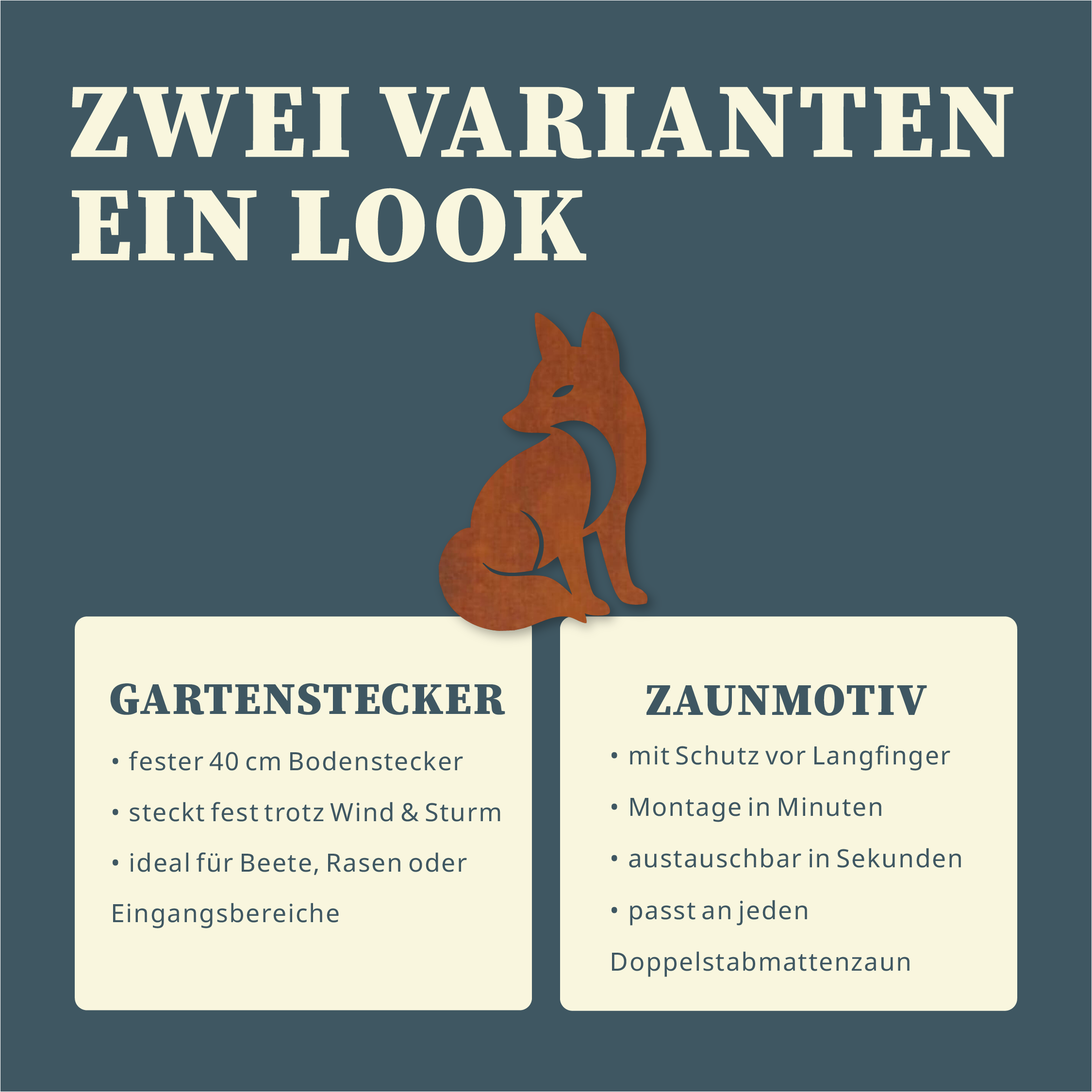 In unserer Zaunfiguren-Kollektion findest du weitere Motive. Gemeinsam mit dem Fuchs entsteht ein Ensemble, das deinen Garten lebendig macht und Geschichten erzählt.