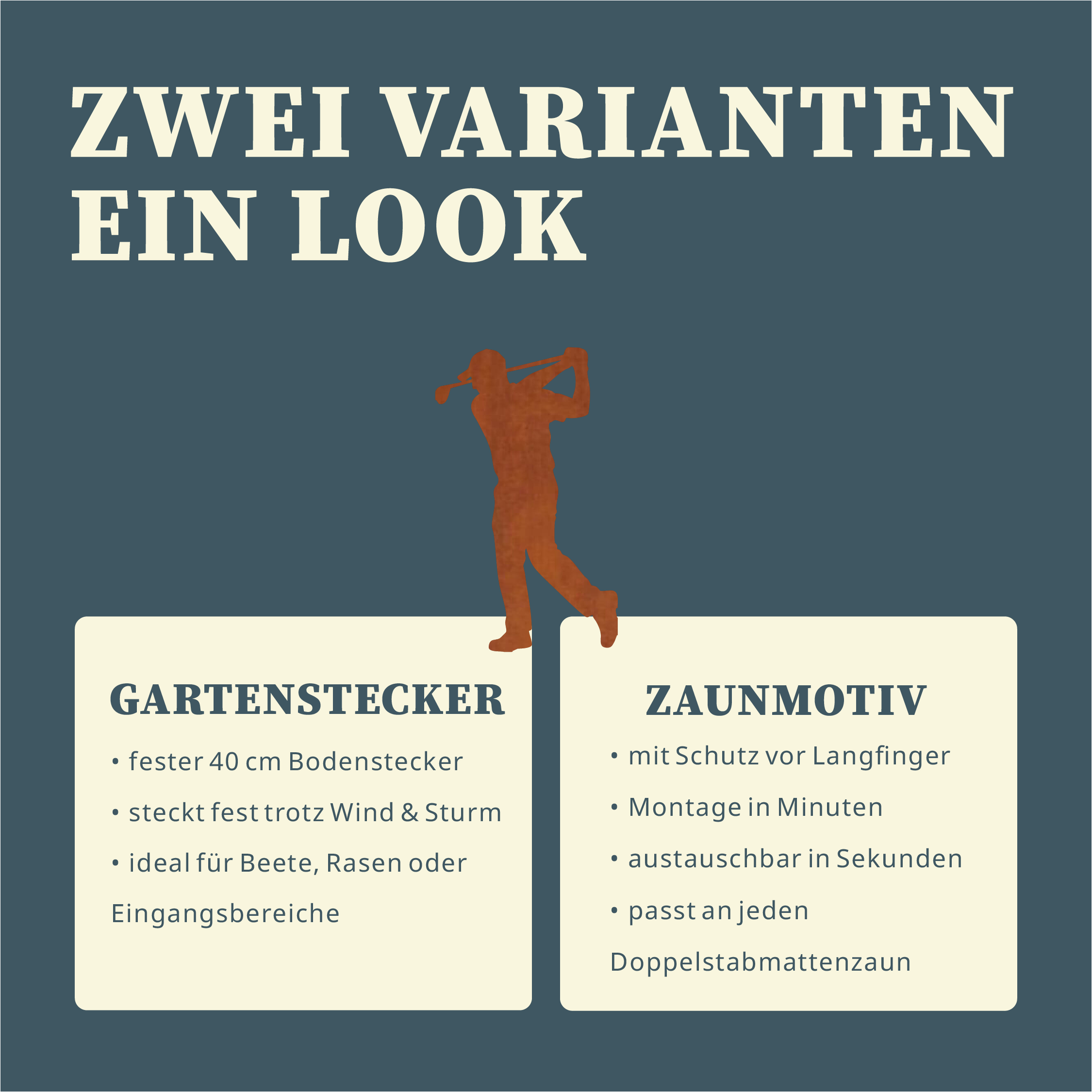 Ob als Geschenkidee, als Akzent am Zaun oder als Blickfang im Blumenbeet – die Golfer Silhouette zeigt,