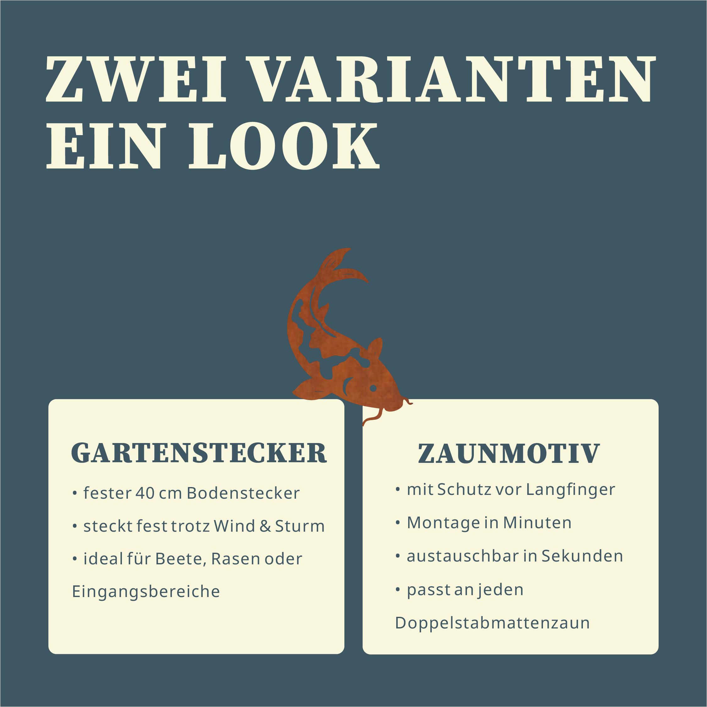 Die Montage ist unkompliziert: Mit der Federstahlklammer befestigst du den Koi stabil am Doppelstabmattenzaun. Eine Schraube sorgt für festen Halt, und du benötigst lediglich einen normalen Schraubendreher. Alternativ kannst du den Koi als Gartenstecker direkt im Beet platzieren. Die Konstruktion ist robust, windfest und darauf ausgelegt, viele Jahre Freude zu bereiten. Der Austausch gegen andere Motive gelingt jederzeit schnell und einfach.